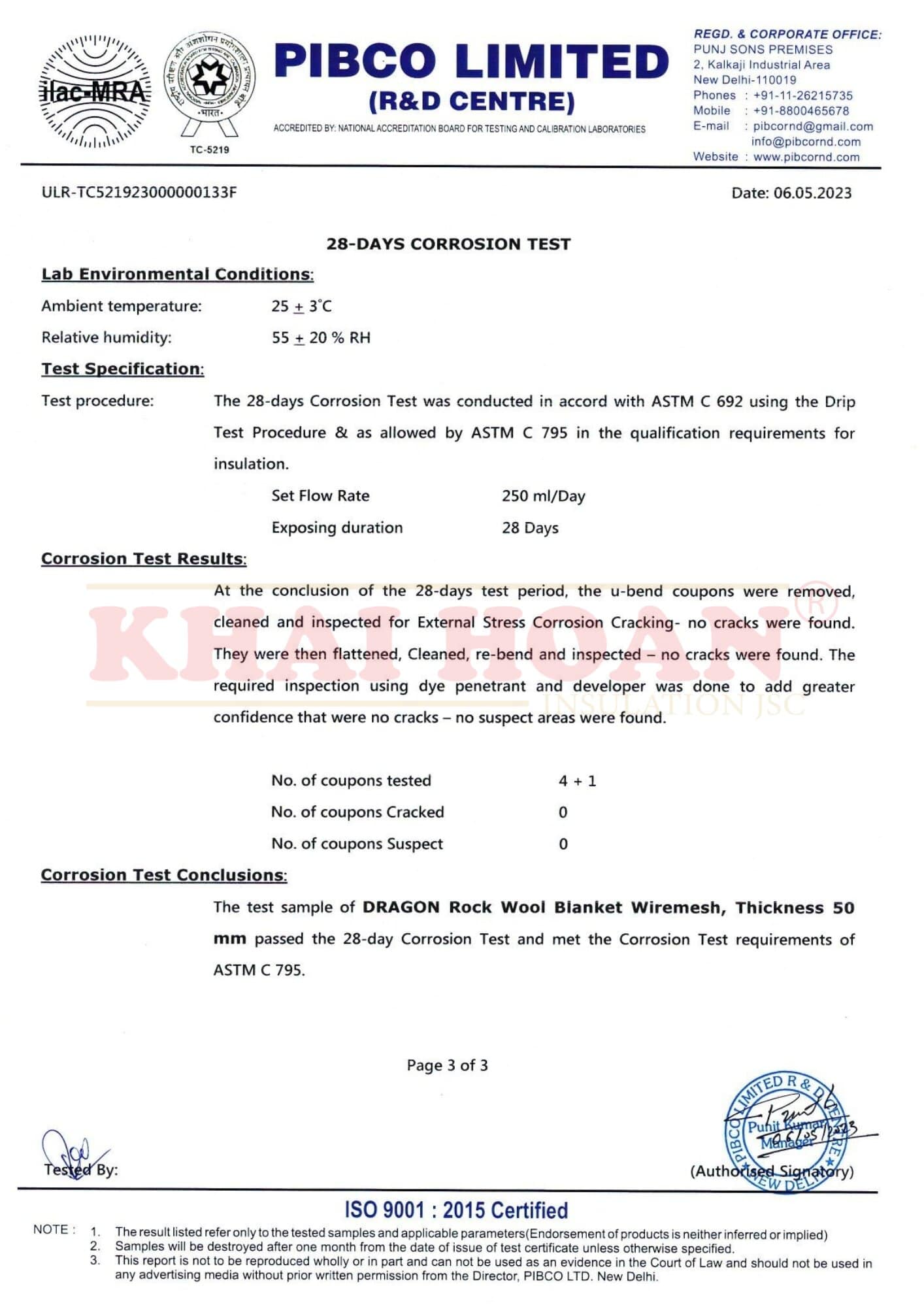 Sản phẩm DRAGON Rock Wool đã được thí nghiệm theo tiêu chuẩn ASTM C795 và đã vượt qua được bài kiểm tra và tính ăn mòn. Hoàn toàn đáp ứng được các yêu cầu đối với CUI, mang đến sự an toàn và giảm các nguy cơ tiềm ẩn về tính an toàn.