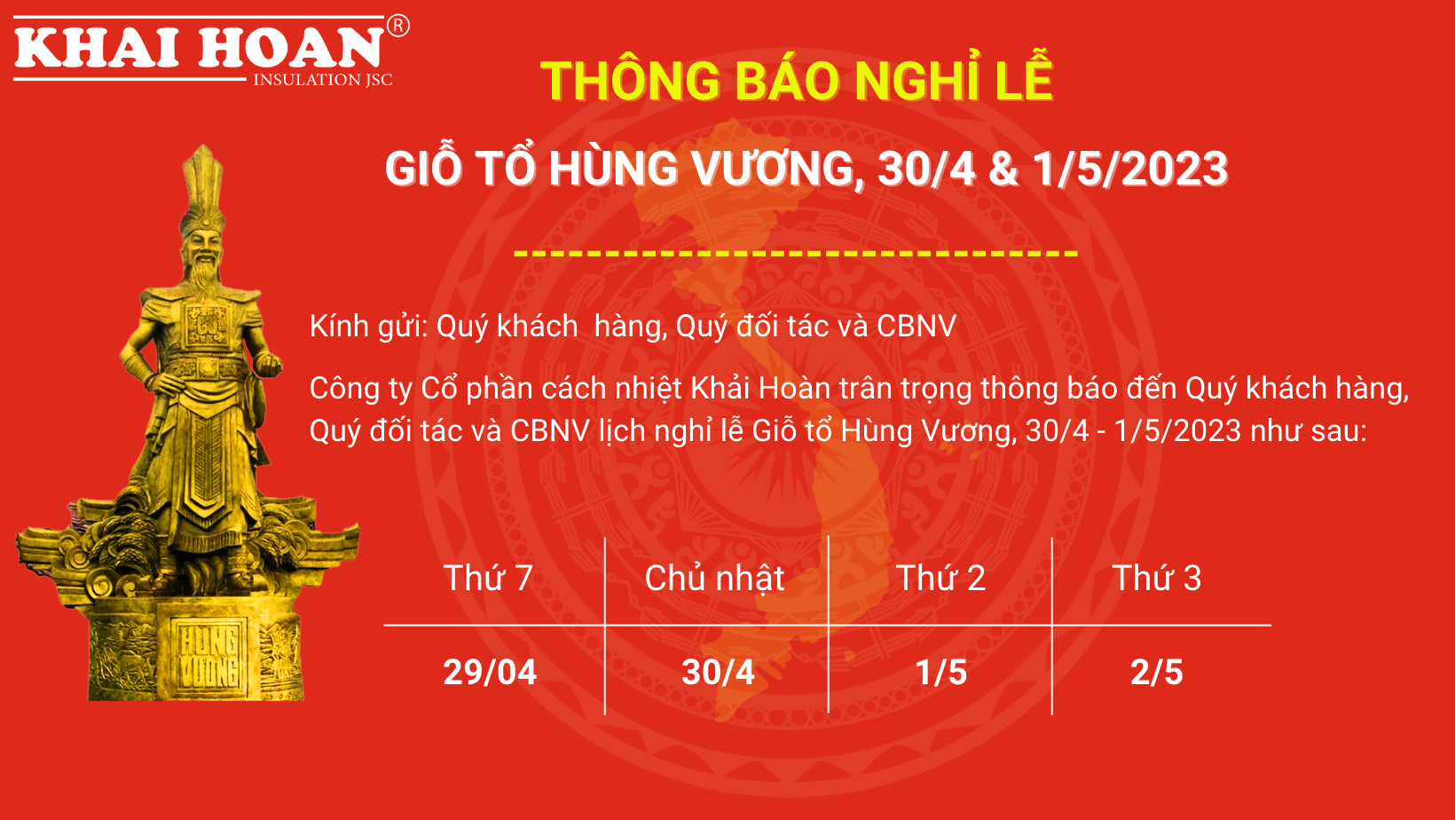 Công ty cổ phần cách nhiệt Khải Hoàn xin trân trọng thông báo tới Quý khách hàng, Quý đối tác và CBNV lịch nghỉ lễ mừng Giỗ Tổ Hùng Vương (mùng 10/3 âm lịch), ngày Giải phóng Miền Nam (30/04) và ngày Quốc tế Lao Động (01/05) cụ thể như sau: