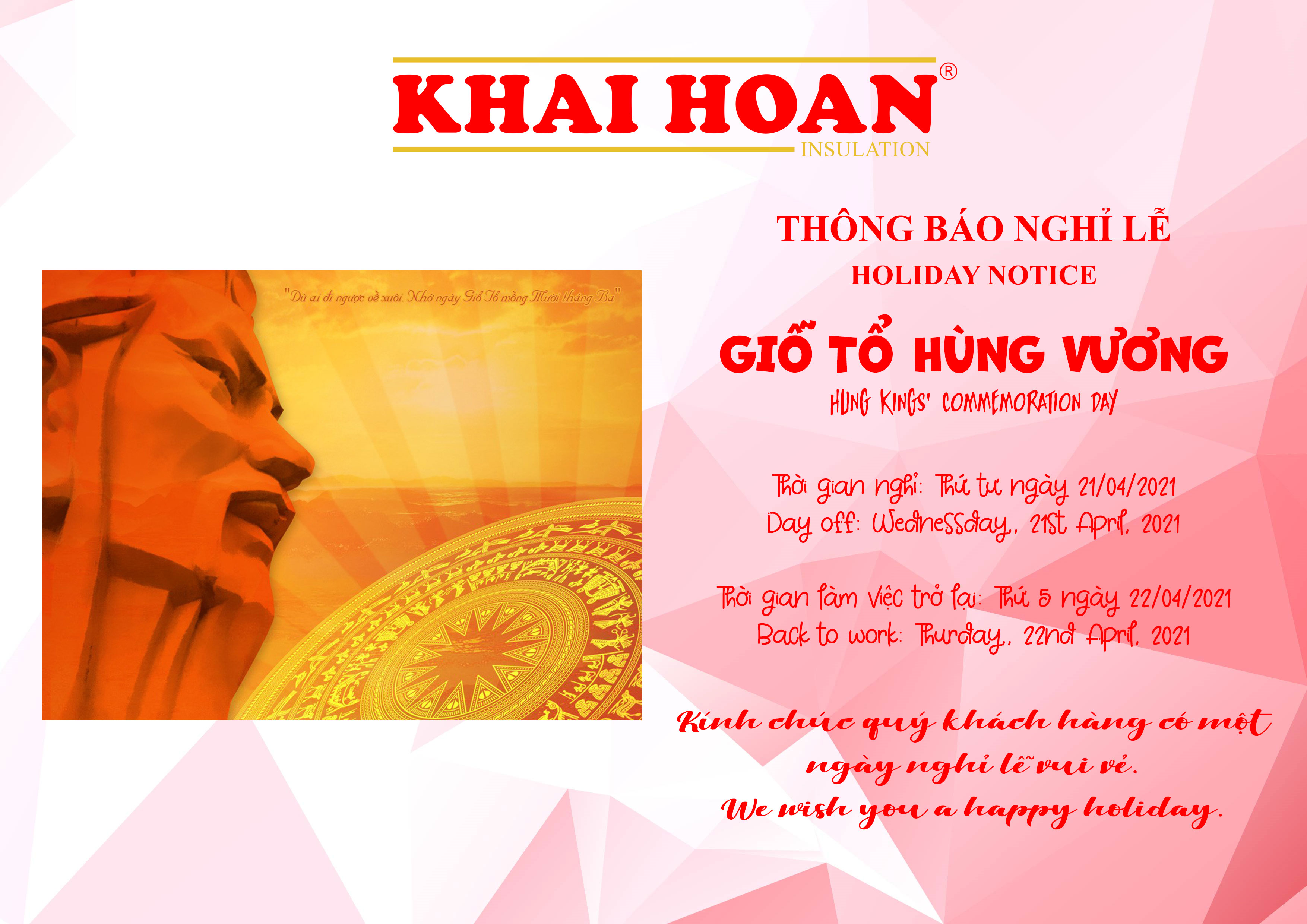 Công ty TNHH KHẢI HOÀN nghỉ lễ giỗ Tổ Hùng Vương vào ngày thứ Tư mùng 10/03 nhằm ngày 21/04/2021 DƯƠNG LỊCH đối với văn phòng và làm việc lại bình thường ngày Thứ Năm 22 – 04 – 2021